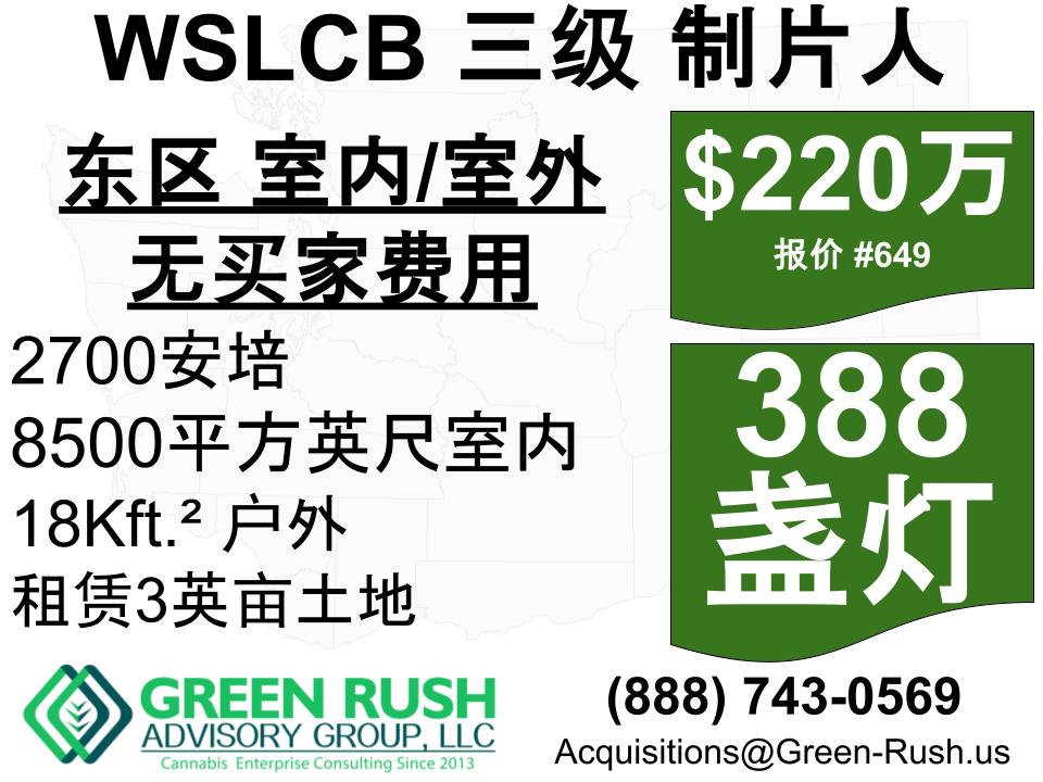 388光 EASTSIDE I-502 / WSLCB 三级大麻生产商/加工商 高容量EASTSIDE T3生产商/加工商,永久租赁3.5英亩全围栏许可场地,建筑面积23,000平方英尺,480V三相电2700安培! 拥有最先进的无溶剂加工能力,配备无溶剂加工特权、组织培养实验室,并因顶级花束、活树脂花车、预卷和预浸预卷而成为屡获殊荣的品牌。 290个Fluence LED花灯 98 Gavita LED 蔬菜灯 2700安培,480伏特,三相电源 3.5英亩许可经营场所的永久租赁 超过23,000平方英尺的建筑空间,并有可能增加室内空间 8500平方英尺室内天棚,用于种植顶级花卉 18,000平方英尺的可持续优质AG土地用于户外天篷区域 [...]