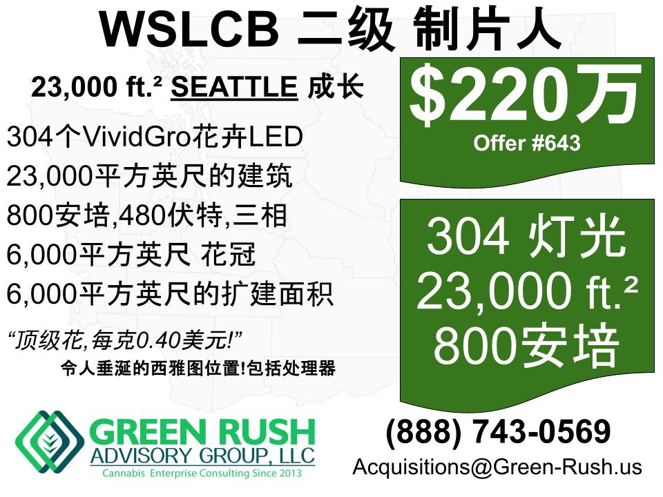 304-Light Seattle I-502 / WSLCB 二级 制片人/处理器 出售 容量、空间、动力和西雅图优越的地理位置! 顶级大麻,每克0.40美元! 这款高容量二级大麻生产商/加工商是专为大规模生产优质大麻而设计的,每克成本尽可能低。 该工厂位于一栋23000平方英尺的建筑内,配备800安培的480伏三相电源,目前运行着304个高端花卉LED,为6000平方英尺的顶棚提供照明,此外还有 6000平方英尺的顶篷空间可供使用——这座独一无二的西雅图二级植物工厂采用专有的大容量生产方法生产工艺大麻,每克生产成本极低。 创始人决心完善高效种植顶级大麻,这种决心渗透到这家精心设计的二级生产商/加工商的方方面面。 高级功能,例如VividGro V2和V1 LED,具有工厂定制的光谱和PAR参数,专业负载计算和污染缓解的VRF HVAC系统,以及比传统温室节能60%的温室,所有这些都表明,以尽可能低的成本大规模种植优质大麻是一种严谨且不惜成本的方法。 目前运营着8个温室中的3个。另外6000平方英尺的顶棚空间已准备就绪,可以扩建,并且已经全部建成, 西雅图难寻之地 [...]
