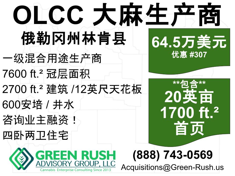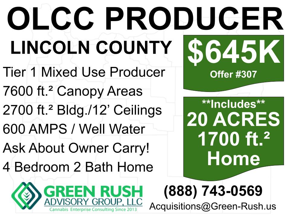 林肯县混合用途OLCC娱乐大麻生产商,含20英亩土地及住宅,现正出售 42盏灯非运营型交钥匙大麻种植场,含20英亩僻静地块及1740平方英尺住宅! 仅需15,000美元即可获得整套大麻种植业务! 所含20英亩地产当前评估价值达680,000美元,因此695,000美元的标价意味着买家仅需支付15,000美元——远低于市场价——即可获得整套交钥匙式混合用途一级大麻生产业务,包含OLCC大麻生产商执照及全部种植资产! 即刻启动种植! 7,600平方英尺现成种植棚空间 42盏LED灯+3,500平方英尺室内种植棚 4,100平方英尺室外种植棚 20英亩地块可扩建! 包含的20英亩地块蕴藏巨大扩展潜力 驻场生活! 入住4卧2卫1,740平方英尺住宅!完美适配业主自营或员工宿舍 仅售64.5万美元!(含20英亩地块的评估价值超68万美元) 报价编号#307 立即联系我们!acquisitions@green-rush.us / (888)-743-0569 7600平方英尺室内/室外花棚覆盖面积 3500平方英尺室内花棚覆盖面积 / [...]
