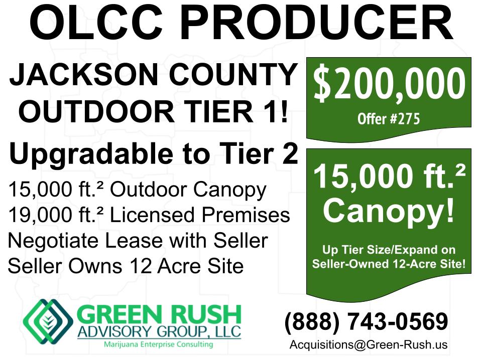 JACKSON COUNTY OLCC OUTDOOR TIER 1 RECREATIONAL MARIJUANA PRODUCER FOR SALE, OFFER #275