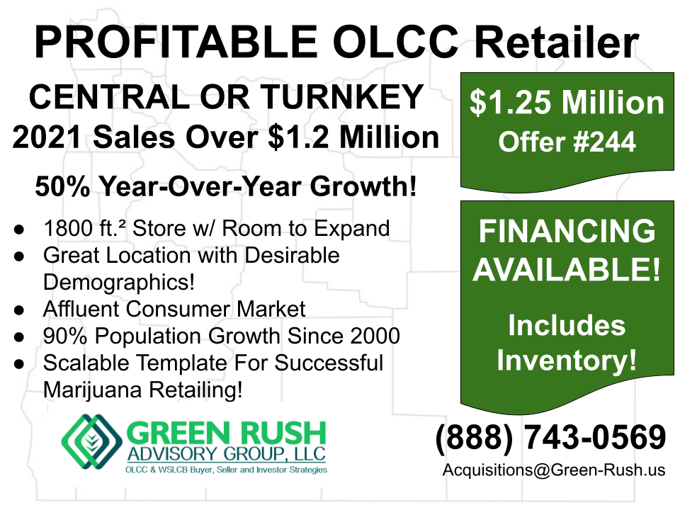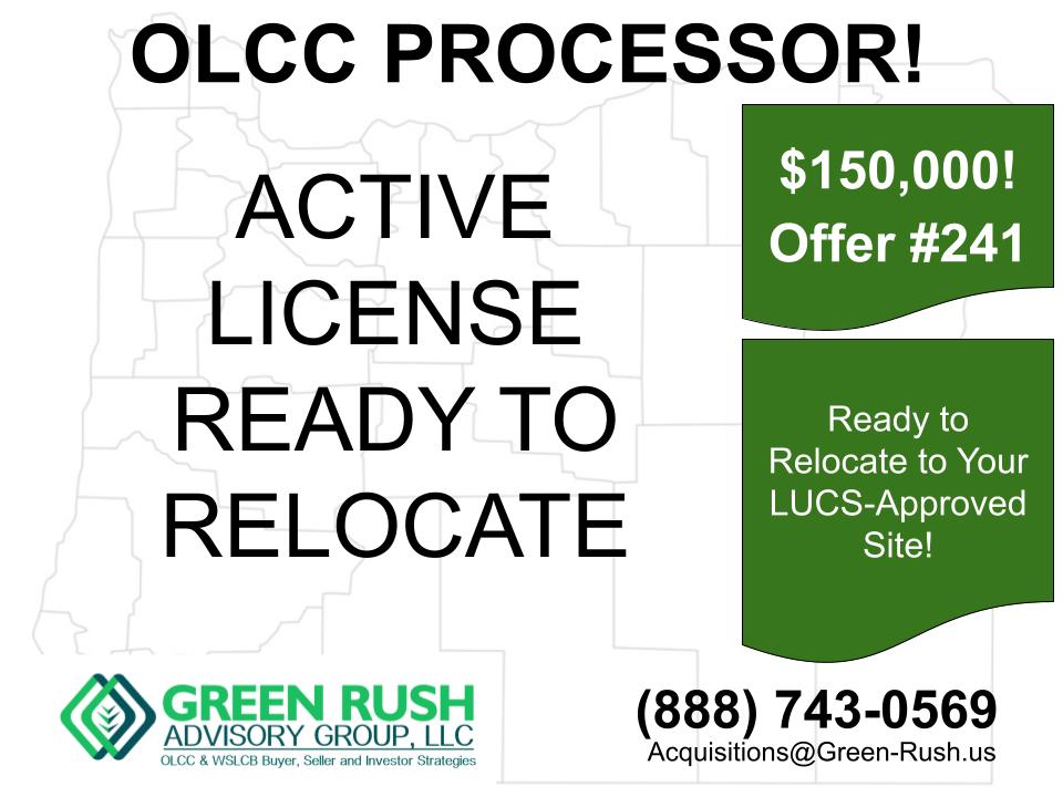 OLCC PROCESSOR ACTIVE License Needs Location Prefer Buyers with LUCS-Approved Site $150,000 Offer #241 Call us today! (888)-743-0569 CURRENT OLCC-APPROVED [...]