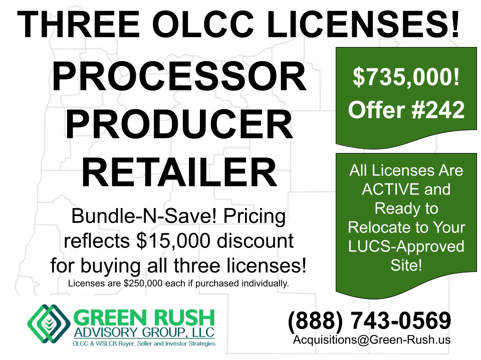 THREE OLCC LICENSES RELOCATION TRIFECTA! OLCC RECREATIONAL PROCESSOR OLCC RECREATIONAL PRODUCER OLCC RECREATIONAL RETAILER ACTIVE Licenses Need Location Prefer Buyers [...]