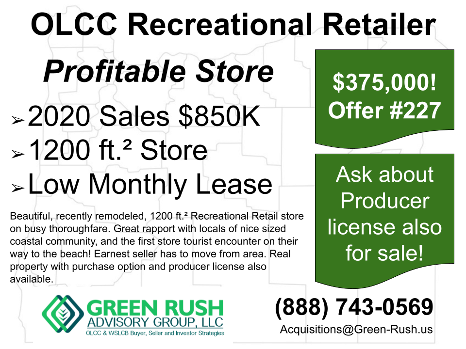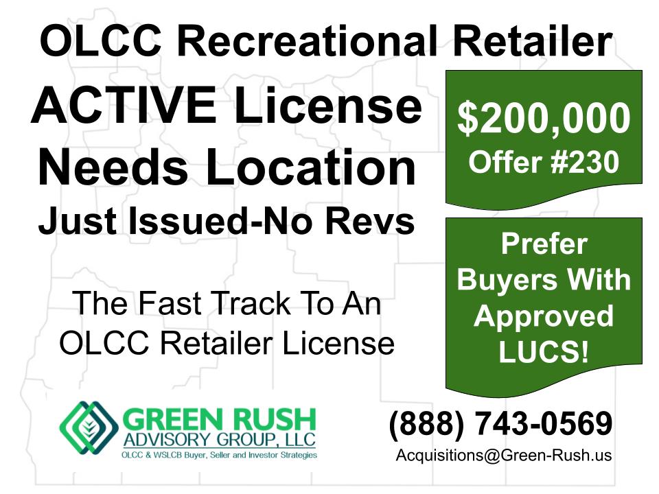 OLCC Recreational Retailer ACTIVE License Needs Location Just Issued-No Revs $200,000 Offer #230 Call us today! (888)-743-0569 Buy Smarter! The [...]